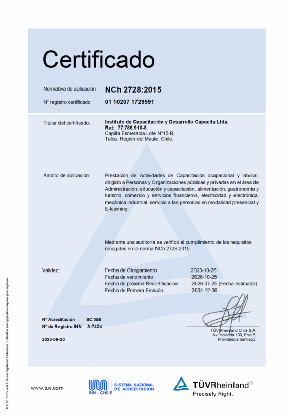 INSTITUTO CAPACITA LTDA. 1 norte 1077. Edificio Bicentenario Oficina 608, Talca, Chile Teléfonos: +56 9 79788837 / +56 9 78771650 / +56 9 91589716 - TALCA - CHILE
